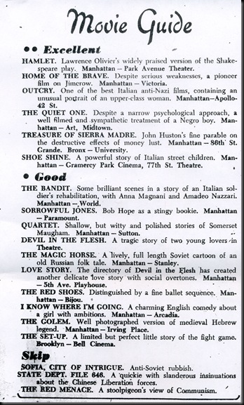 The most entertaining recurring column that we found was—hands down—the “Movie Guide” in which the entertainment staff of the paper picked and panned films in (then) current release. In the August 4, 1946 issue, the recommended movies included such titles as HELLO MOSCOW, HYMN OF NATIONS and LIBERATION OF EUROPE. On the other end of the spectrum, in the June 28, 1949 column, the following films received negative capsule reviews in a style worthy of a Red Leonard Maltin: